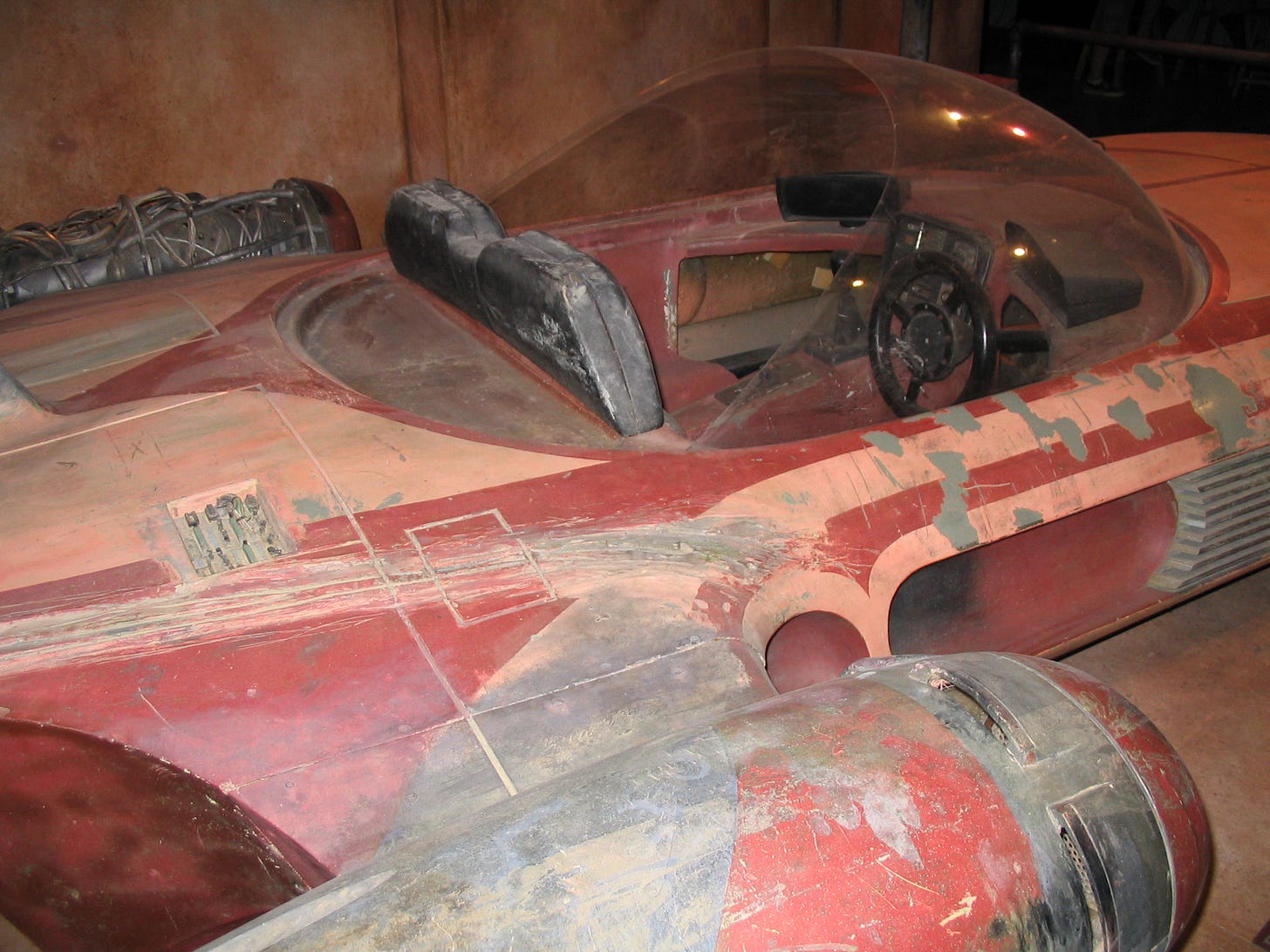 There was one other technique that was used that didn’t involve antigravity or multiple jet engines. In the scene where Luke pulls up to his former home after Stormtrooper had burned it (RIP Uncle Owen and Aunt Beru), the landspeeder (the one above, I believe) was kind of “dollied” into view. When connected to that dolly system, the landspeeder would only roll around in a circle.