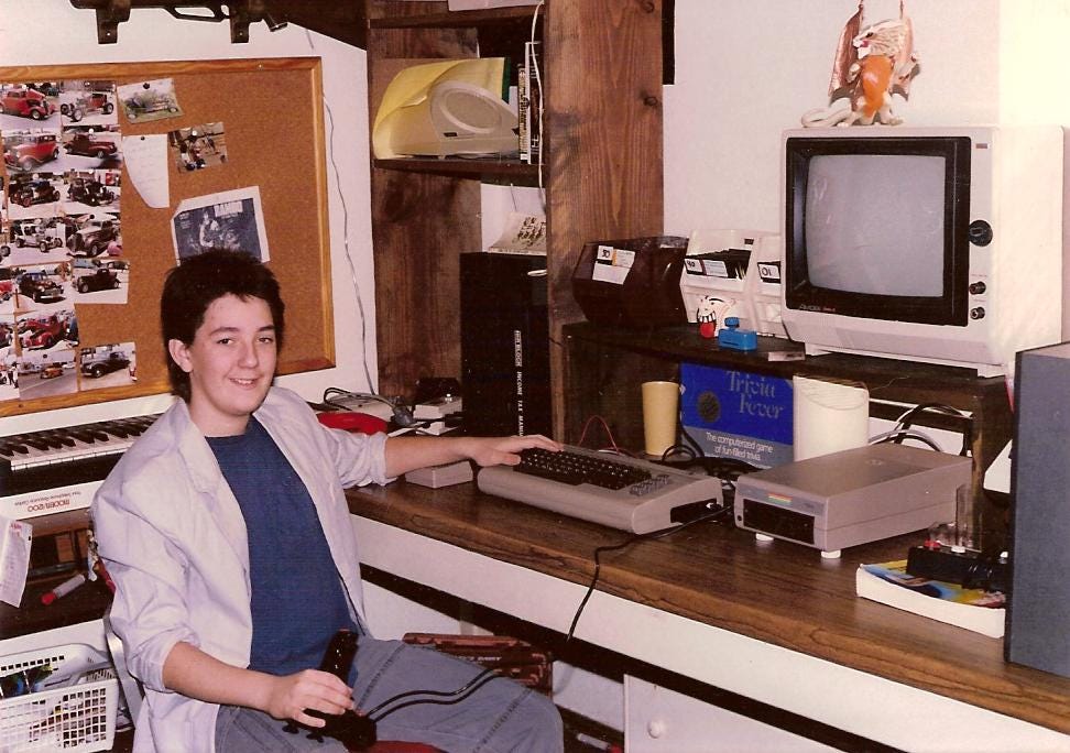And the thing was, the impact Miami Vice had on pop culture permeated every pore of 80s fashion… whether you watched the show or not. I did not watch Miami Vice regularly. Here is a picture of me from 1986 in front of my computer. I’ve shared this picture before, but I’m sharing it this time to point out that I’m wearing a Miami Vice jacket. That day I was wearing a blue undershirt but I had plenty of neon yellow and pink ones I wore with it, too. Oh, and this was not the only Miami Vice jacket I owned. I had both a white one and a gray one which I apparently wore even when I was sitting at home alone.