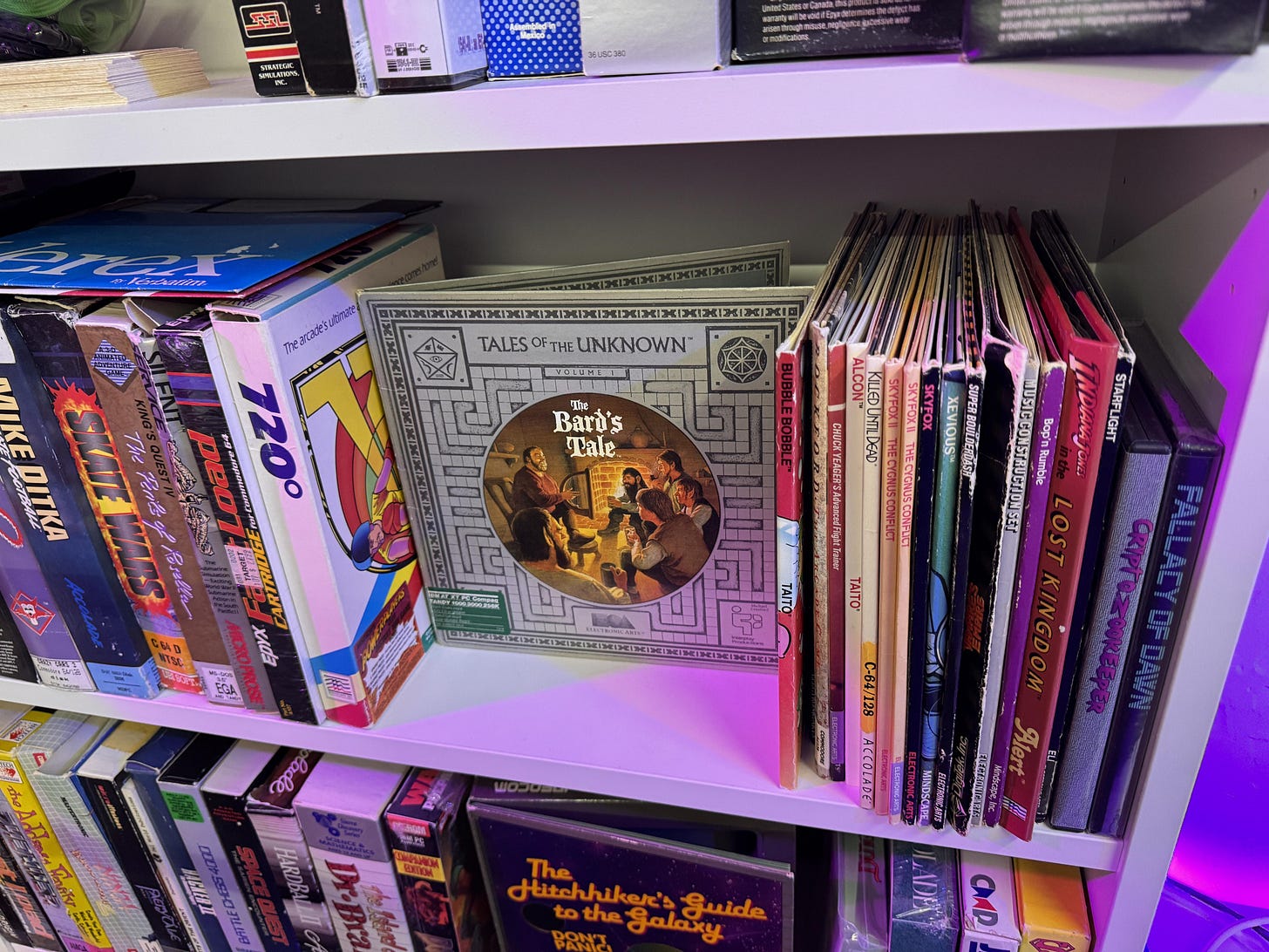 Last week on eBay I purchased a copy of Bard’s Tale. It’s not even the Commodore 64 version. I think it’s the IBM PC version, but the box and packaging are identical. I don’t even know if the disk works, and to be honest I don’t care. In a way, it’s like Schrödinger’s floppy disk. As long as I don’t test it, it probably works, or maybe it doesn’t. Either way, I’ll never play it. I put the box up on display on a shelf next to my little retro gaming nook. I will never play this copy of Bard’s Tale. In fact, I may never play Bard’s Tale again. It was a great game in the 1980s, but modern interfaces have made those old games difficult, if not impossible, to revisit. Things like auto-mapping and auto-saving have really spoiled modern gamers.