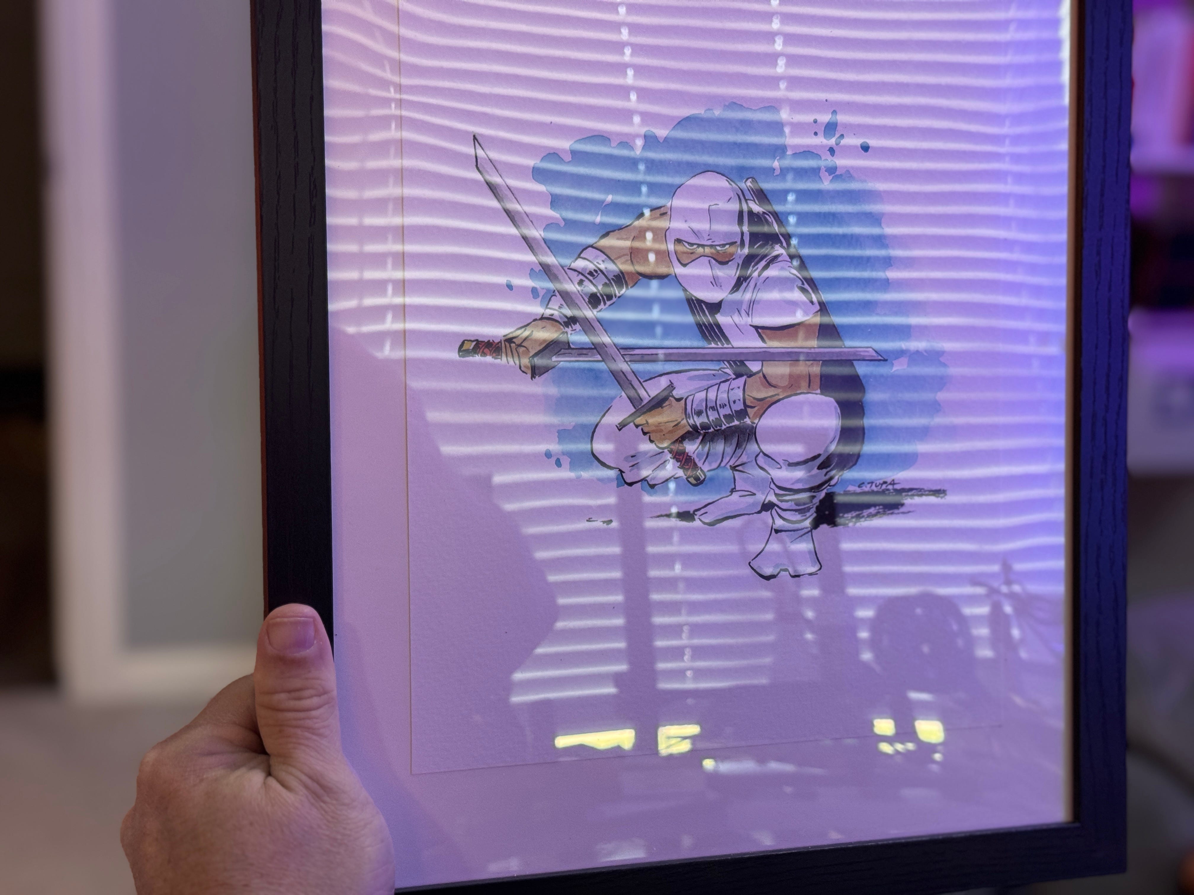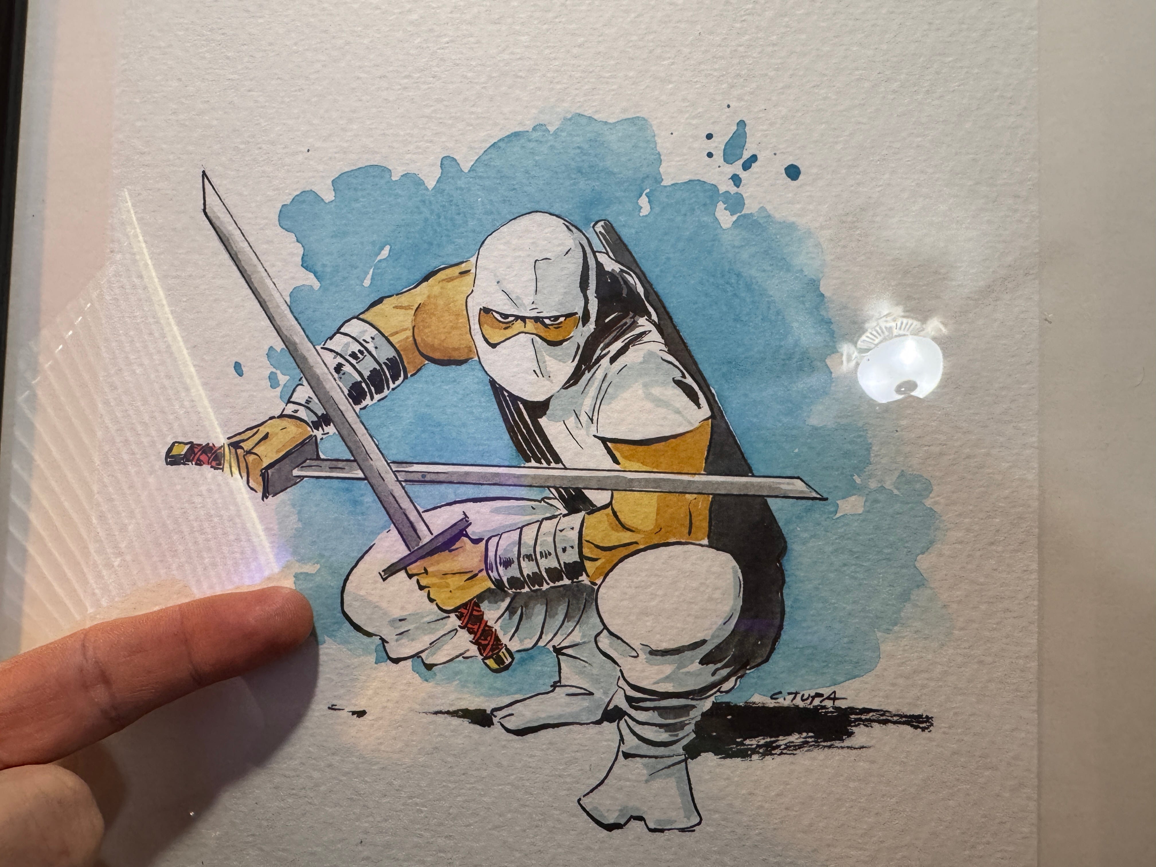 The finger in the picture is mine. Faster than a ninja can draw his sword, I bought it. the artwork arrived in packing so think and rigid I thought I’d forgotten and ordered a hardback book. After peeling away layers of cardboard and manilla envelopes, I found the white ninja inside, hiding. You know, like how ninjas do.