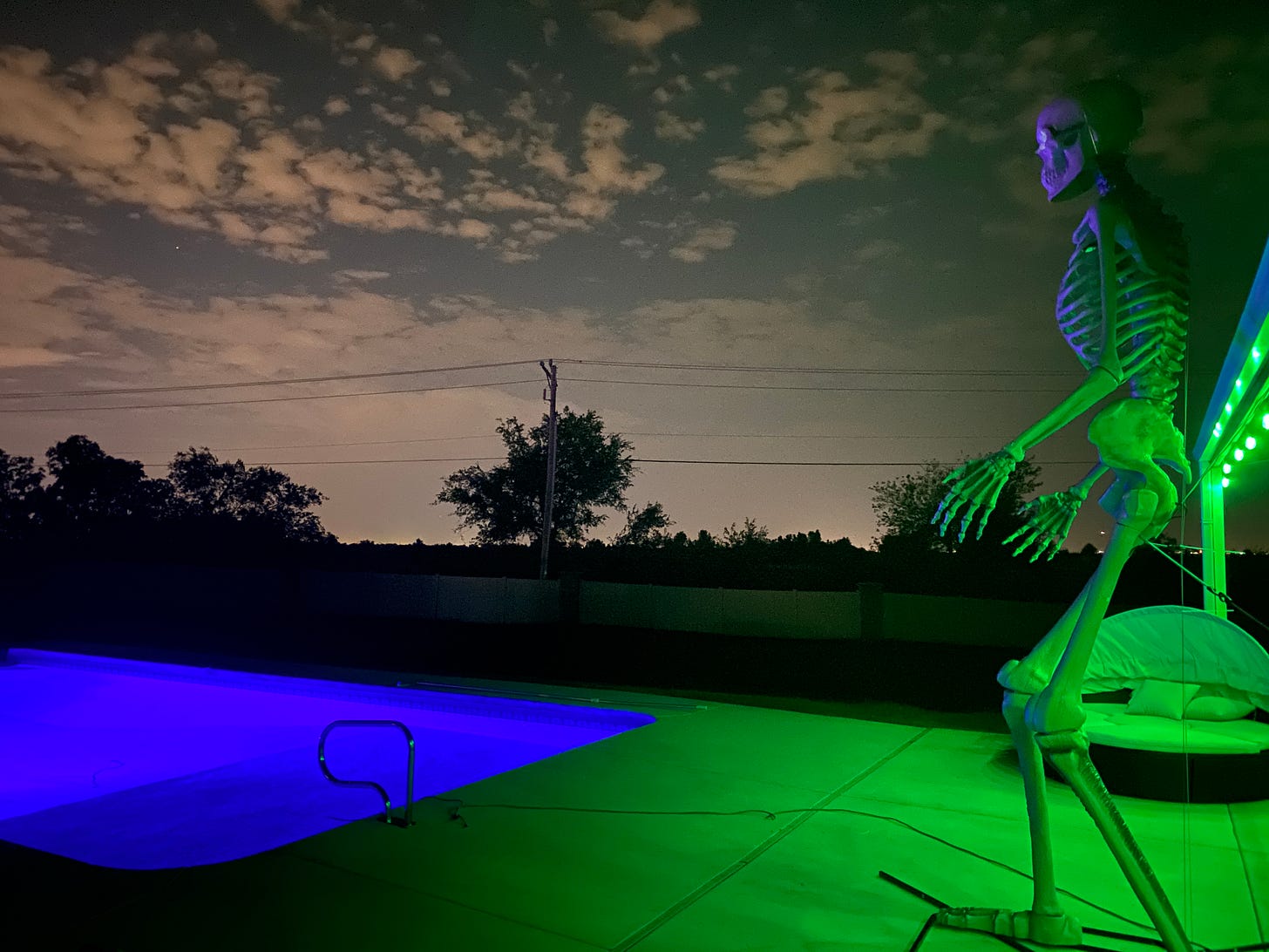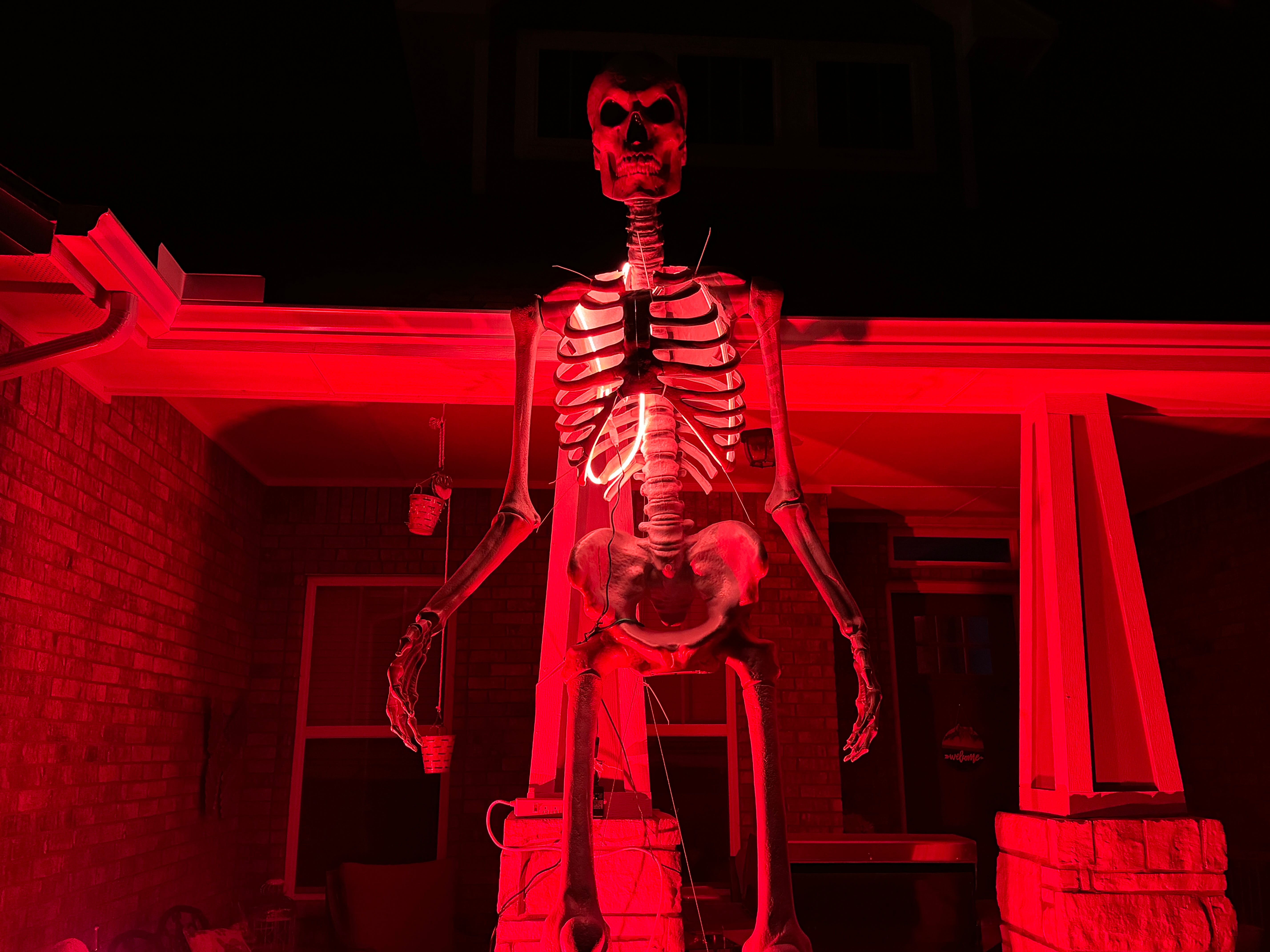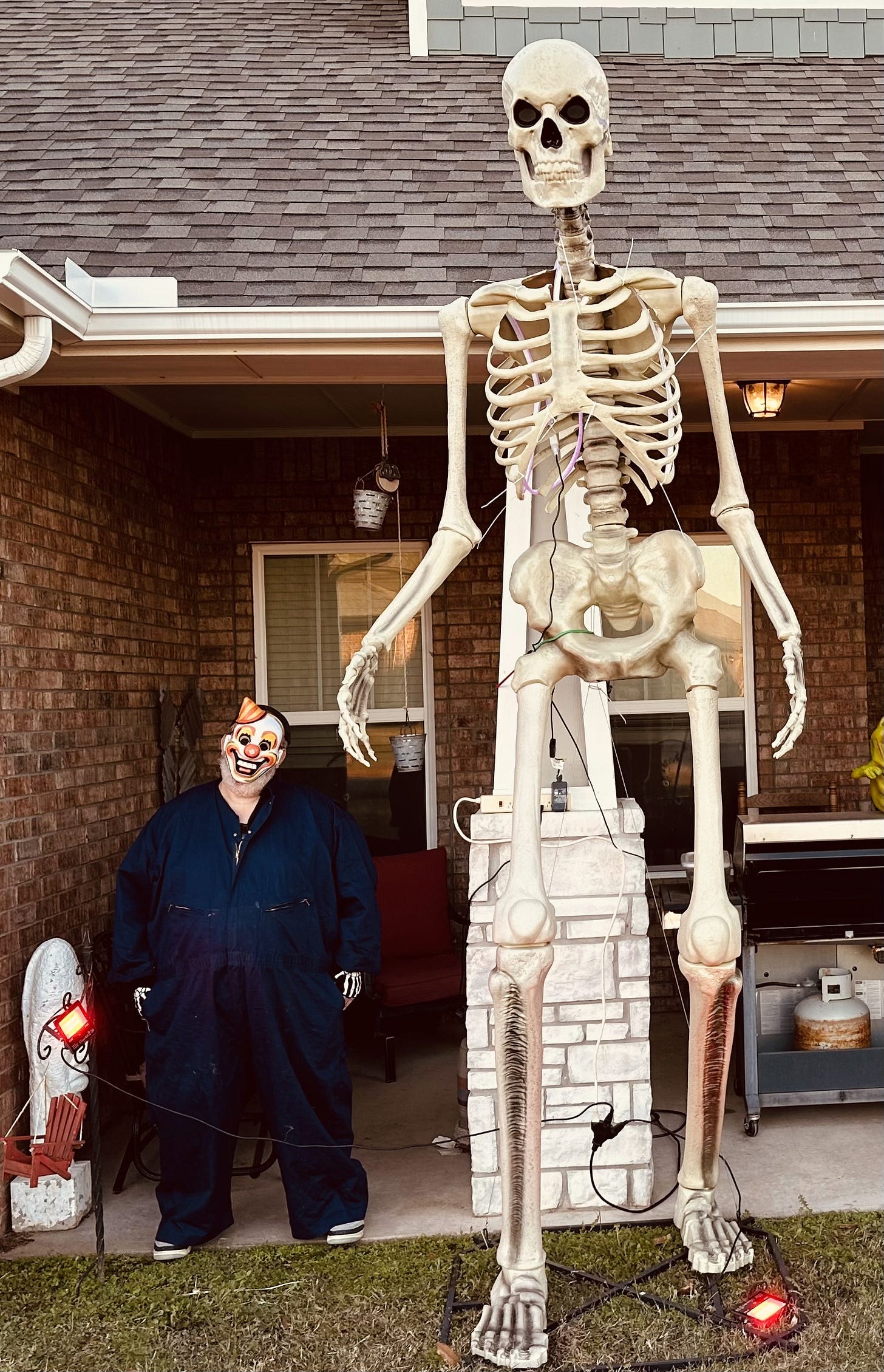 Normally I prefer homemade costumes and decorations when it comes to Halloween. As a kid there was nothing worse than running into another kid in the neighborhood wearing the exact same costume you had on. I rarely had to worry about that; as a kid my mom made a lot of my costumes, and looking back I am so appreciative of that. I was a little hesitant about buying the 12-foot skeleton because I was afraid everyone would have one and what’s the fun in that? Fortunately there don’t seem to be a lot of people shelling out $300 for oversized yard decorations, at least not in this neighborhood. They’re certainly not rare, but having one makes you an honorary member of the weirdo clan. There’s a whole ‘nother club of people who keep this things up year round, decorating them like leprechauns and the Easter Bunny and even Santa when it’s time, but again with my HOA in mind, I take mine down the first week of November like a thief in the night before some uptight Karen can stick a nastygram in my mailbox.