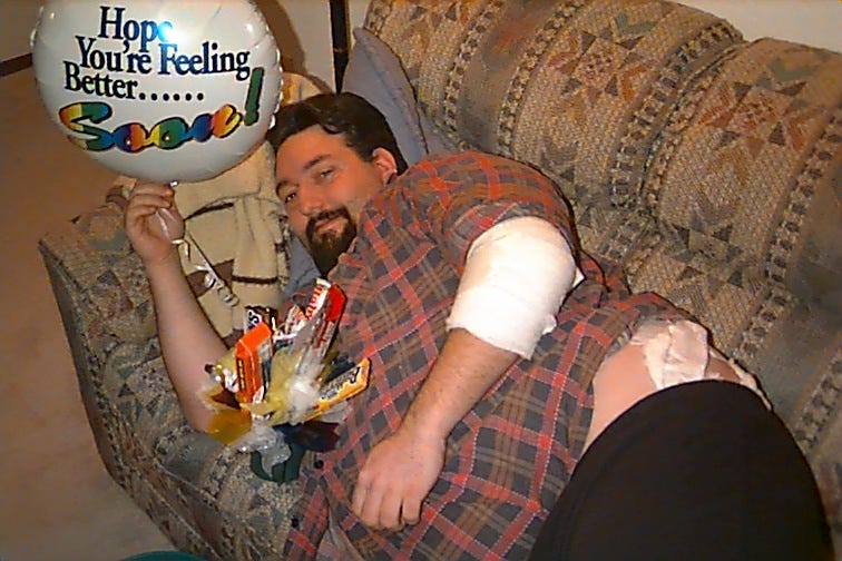 Not long after I purchased that skateboard I developed back problems. When I was 25, while walking down the side of the interstate after running out of gas I was struck in the back by a passing pickup truck doing 70mph. It was a glancing blow that sent me flying through the air, but after a few hours in the local ER I was sent home with just a few stitches, a bruise the size of a medium pizza, lots of swelling and, apparently, lingering back pain. Yay!